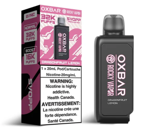 The Dragonfruit Lemon flavour SVOPP 32K Pod from Oxbar x Rockey Vapor delivers up to 32000 puffs of vapor using 20mL of prefilled e-liquid, when paired with an SVOPP battery (required).