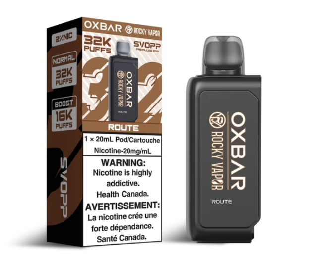 The Route flavour SVOPP 32K Pod from Oxbar x Rockey Vapor delivers up to 32000 puffs of vapor using 20mL of prefilled e-liquid, when paired with an SVOPP battery (required).