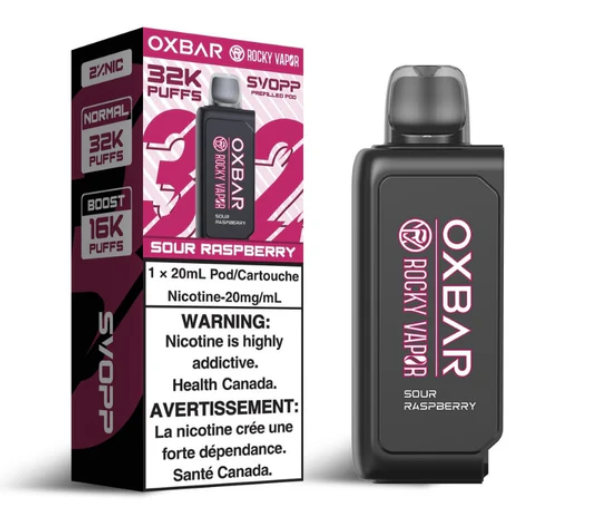 The Sour Raspberry flavour SVOPP 32K Pod from Oxbar x Rockey Vapor delivers up to 32000 puffs of vapor using 20mL of prefilled e-liquid, when paired with an SVOPP battery (required).