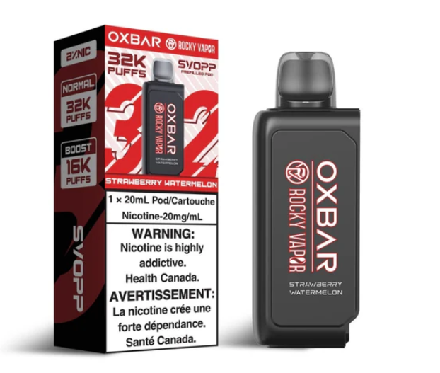 The Strawberry Watermelon flavour SVOPP 32K Pod from Oxbar x Rockey Vapor delivers up to 32000 puffs of vapor using 20mL of prefilled e-liquid, when paired with an SVOPP battery (required).