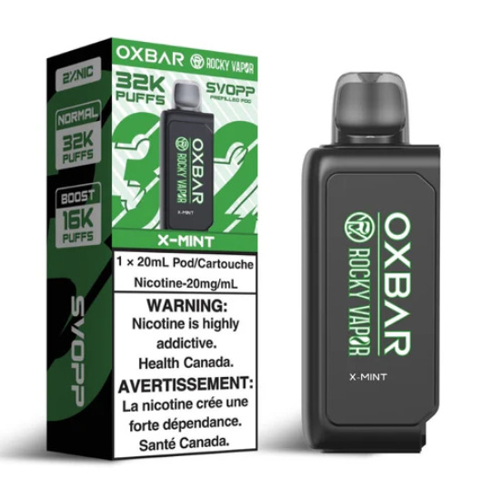 The X-Mint flavour SVOPP 32K Pod from Oxbar x Rockey Vapor delivers up to 32000 puffs of vapor using 20mL of prefilled e-liquid, when paired with an SVOPP battery (required).