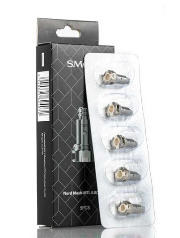 The SMOK Nord Replacement Coil Pack come in two types: Regular and Mesh. The Nord Regular is rated at 0.6 ohm, uses a Kanthal Mesh and has a direct lung airflow. The Nord Mesh is rated at 1.4 ohm, uses a Kanthal coil, and is intended for MTL vaping. Nord Replacement Coils have two o-rings on the top and one o-ring on the base for a quick plug and play system.