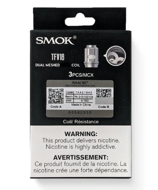 100% Authentic SMOK. All-new SMOK TFV18 coil series designed for SMOK’s latest release – MAG18 Starter Kit and SMOK TFV18 tank. SMOK TFV18 tank boasts a generous 7.5ml e-liquid capacity for endless enjoyment. Featuring a convenient top-fill system [CRC Version] and bottom adjustable airflow. Press-fit coil installation allows for a quick and seamless transition so you never miss a cloud.